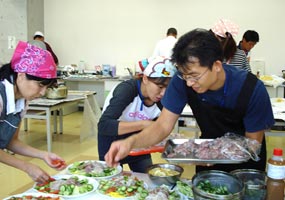 この日、漁師さんが指導しつくってくれたお魚料理は、江戸前の魚介類を使った天ぷらやカルパッチョ、アジのすり身のハンバーグ、アサリ汁。こどもたちは歓声をあげて東京湾の恵みを存分に味わいました、そして漁師さんにたくさんの質問をしました。そして最後にこどもたちから「これまで知らないことばかりだったけど、今日は東京の海のことをよく知ることができました。ありがとうございました」とお礼のあいさつ。丸裕二会長は「自然を大切に、海を汚さないようにしてください」と呼びかけ、会をしめくくりました。